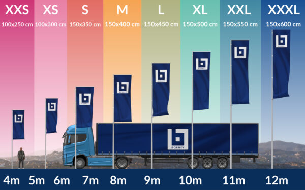 La taille d’un drapeau dépend généralement de la hauteur du mât qui le reçoit. Nous proposons en standard 8 tailles d’oriflamme. A l’aide de l’image ci-dessous déterminez la taille de qui vous convient.